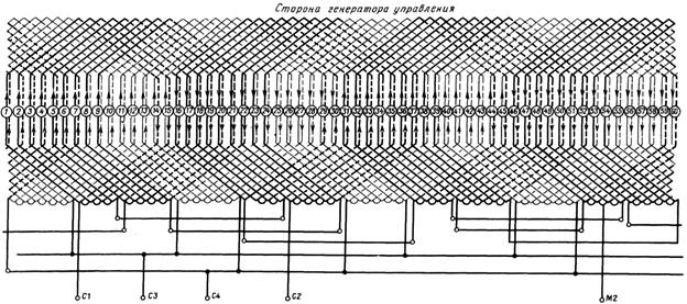 Нормальная работа расщепителя фаз обеспечивается при колебании напряжения питающей сети в пределах 280—460 В. Обмоточные данные расщепителя фаз приведены в табл.5. Шариковый подшипник со стороны, противоположной реле оборотов, работает как плавающий вследствие наличия зазоров между наружным кольцом подшипника и внутренней и наружной подшипниковыми крышками. Допустимая температура нагрева подшипников не более 80°С. На статоре расположены две обмотки — двигательная и генераторная. Первая из них подключена к обмотке собственных нужд тягового трансформатора. Вспомогательные электродвигатели подсоединяют к зажимам С1, С2, СЗ расщепителя фаз (рис. 8). Направление вращения расщепителя фаз по часовой стрелке, если смотреть со стороны короткого конца вала (со стороны реле оборотов); при этом коробка выводов должна быть с левой стороны. Для изменения направления вращения ротора расщепителя фаз необходимо в пусковой схеме конец генераторной фазы СЗ статора на панели выводов переключить (через резистор) на другой зажим.
