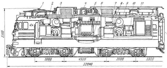 Рис 11. Расположение оборудования на секции электровоза ВЛ80Т: 1 — токоприемник; 2— фазорасщепитель; 3— мотор-вентилятор; 4 — главный воздушный выключатель; 5 — главный контроллер; 6 — тяговый трансформатор; 7 — тормозные резисторы; 8—выпрямительная установка; 9 — главный воздушный резервуар; 10 — мотор-компрессор; 11 — высоковольтная шина.