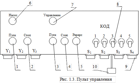6. Пульт управления (рис 1.3) предназначен для пуска и останова электродвигателя насосной установки, а также для коммутации электрогидрораспределителей и конечных выключателей. Кнопки 1 (пуск) и 2(стоп) предназначены для пуска и останова насосной установки. Кнопки 3 (пуск) и 4 (стоп) - для включения и отключения цепей управления. Кнопка 5 (реверс) - для изменения направления вращения гидромотора, входящего в состав гидроаппаратов. Световые индикаторы 6 и 7 загораются соответственно при подаче напряжения на насосную установку и в цепи управления. Тумблеры 8 предназначены для набора кода лабораторных работ. Кнопки 3, 5, 4 и тумблеры 8 (с 1 по 5) используются при выполнении лабораторных работ, в которых предусмотрены гидрораспределители с электроуправлением. В нижней части пульта установлены разъемы 9 для подключения электрораспределителей и конечных выключателей. Напряжение постоянного тока 24 В подается на пульт управления от блока питания посредством разъема 10. К разъемам XI, ХЗ подключаются кабели от гидрораспределителей с электроуправлением, а к разъемам Х2, Х5 - кабели от конечных выключателей.
