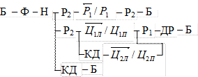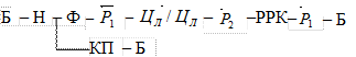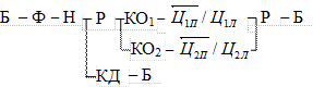 Элемент цикла «I рабочая подача» осуществляется переключением распределителя Р1 в левое положение, тогда жидкость будет подаваться через следующие гидроаппараты: насос Н - фильтр Ф- распределитель РІ - цилиндр Ц - распределитель Р2- дроссель ДРК и регулятор расхода с обратным клапаном РРК одновременно (расход дросселя суммируется с расходом регулятора расхода) - распределитель Р1 - сливной бак Б. Так как суммарный расход дросселя и регулятора меньше расхода насоса, то излишки рабочей жидкости сливаются через предохранительный клапан КП в бак Б. Иначе, это можно записать следующим образом: