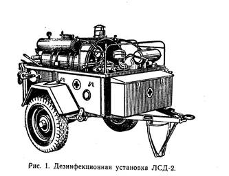 В крупных животноводческих хозяйствах промышленного типа, на мясокомбинатах, заводах первичной переработки сырья животного происхождения, на железнодорожном и морском транспорте и других объектах дезинфицируют в год миллионы квадратных метров площади. В широких масштабах осуществляют также дезинсекционные и дезинвазионные мероприятия. Для выполнения этих работ используют мощные механизмы и машины, облегчающие и ускоряющие процесс дезинфекции. Высокая производительность, экономичность и высококачественная обработка объекта основные требования, предъявляемые к дезинфекционной технике. Рентабельность дезинфекционных машин и себестоимость проводимых с их помощью работ зависят от коэффициента их использования, от их универсальности. Чем больше работ можно выполнять при помощи той или иной машины, чем длительнее в течение года ее используют, тем экономичнее аппарат и тем меньшая стоимость его амортизации. Ветеринарно-санитарную технику по характеру выполняемых при ее помощи работ делят на следующие группы: специализированные дезинфекционные машины, аппараты для дезинфекции аэрозолями, аппараты для орошения кожного покрова животных, дезинфекционные камеры. Специализированные дезинфекционные машины и аппараты. К специализированным дезинфекционным отечественным машинам относят: дезинфекционную установку ЛСД, ветеринарную дезинфекционную машину - ВДМ, автомобильно-дезинфекционный агрегат АДА, установку дезинфекционную самоходную УДС, установку дезинфекционную передвижную УДП. Все эти машины, предназначены для проведения широкого комплекса ветеринарно-санитарных, противоэпизоотических, лечебных и некоторых хозяйственных мероприятий. С помощью специализированных дезинфекционных машин можно осуществлять: дезинфекцию и дезинсекцию помещений горячими и холодными растворами, суспензиями, взвесями и аэрозолями дезинфицирующих Средств; побелку помещений свежегашеной известью и санитарную их промывку водой; обмывание и опрыскивание животных инсектицидами; аэрозольную обработку животных инсектицидами и репеллентами; детоксикацию при поражении животных ОВ; опрыскивание садов; санитарную промывку асфальтированных дорог и площадок; орошение газонов и почвы на территории и вокруг хозяйства и т. п. Работы проводят специалисты ветеринарно-санитарных станций или ветеринарно-санитарных отрядов. Дезинфекционная установка ЛСД смонтирована на автоприцепе ГАЗ-704 (рис. 1). При необходимости ЛСД легко снять с прицепа и можно установить на пароконной повозке, санях или использовать стационарно. В дезустановке ЛСД-2 применен вихревой насос с приводом от бензодвигателя, позволяющий подавать дезинфицирующие растворы, эмульсии, взвеси или воду под давлением до 5 атм при расходе жидкости 100 л в минуту. Максимальная производительность развивается уже при средних оборотах двигателя. Давление контролируется манометром. Резервуаром для дезинфицирующей жидкости является котел емкостью 360 л, внутри которого расположена топка для подогревания рабочих растворов дезинфицирующих средств. В качестве горючего используется соляровое масло. Для запаса дезинфицирующих средств, топлива и хранения принадлежностей и инструментов в установке имеются два дополнительных бачка емкостью по 20 л каждый и багажник. При использован