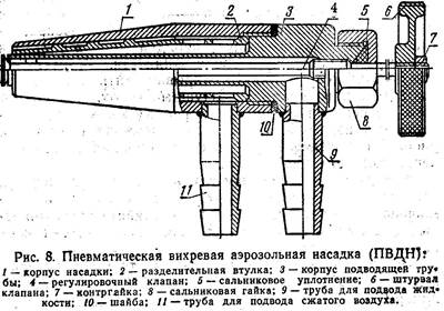 Пневматическая вихревая аэрозольная насадка (ИВАН) обеспечивает получение механических аэрозолей, пригодных для дезинфекции. Она состоит из корпуса со штуцером для подвода сжатого воздуха, трубки для введения жидкости в воздушный поток, регулировочного клапана и конусной разделительной втулки е винтовыми направляющими полосами (рис. 8). Разделительная втулка создает два потока воздуха. Один из Них (внутренний) проходит в кольцевом пространстве между трубкой для жидкости и внутренней поверхностью втулки, второй (наружный) направляется в пространство между внутренней поверхностью корпуса и наружной поверхностью втулки. Благодаря тому, что на наружной поверхности разделительной втулки имеются винтовые направляющие полосы, наружный поток воздуха приобретает спиралеобразное вихревое движение и выходит из сопла в виде широкого факела. Аэрозольная насадка работает следующим образом К одному штуцеру присоединяют шланг от воздушного компрессора (можно применять любой компрессор производительностью по воздуху порядка 30 м), а к другому- шлангдля подвода жидкости. Затем включают компрессор и, плавно открывая вентиль, обеспечиваю доступ жидкости в воздушный поток. С помощью тощ; же вентиля регулируется расход жидкости и дисперсивность аэрозоля. Насадка пригодна не только для распыления дезинфицирующих; растворов, но и для получения вакцинных аэрозолей.