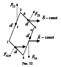 Рассмотрим прямоугольную плоскую рамку с током, помещенную в однородное магнитное поле (рис. 32) так, чтобы линии магнитной индукции были перпендикулярны участкам 1–2 и 3–4 рамки. Для упрощения рисунка провода, подводящие ток к рамке, не показаны. Сдвоенные стрелки представляют вектор магнитной индукции.