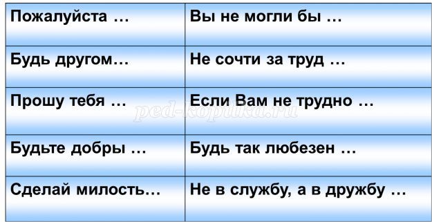Пожалуйста... Вы не могли бы... Будь другом... Не сочти за труд... Прошу тебя... Если Вам не трудно... Будьте добры... Будь так любезен... Сделай милость... Не в службу, а в дружбу...