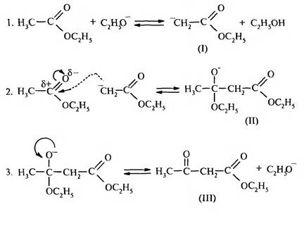 Алкоксид-ион отщепляет протон от α -углеродного атома молекулы эфира. Образуется мезомерно стабилизированный карбанион (I), который, выступая в роли нуклеофила, атакует атом углерода карбонильной группы второй молекулы эфира. Образуется продукт присоединения (II). Он отщепляет алкоксид-ион и превращается в конечный продукт (III). Таким образом, всю схему механизма реакции можно разделить на три стадии: