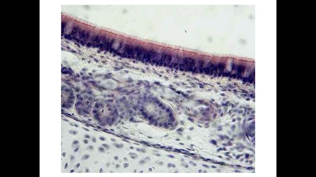 Ядра базальных или коротких вставочных клеток Ядра длинных вставочных клеток Ядра мерцательных клеток Реснички на апикальной поверхности мерцательных клеток Бокаловидные клетки Рыхлая соединительная ткань под эпителием