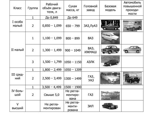 В СССР развитие автомобилестроения шло, начиная с 1942 г., с использованием перспективных типажей автомобилей, т.е. систематизированной группировки всех базовых разновидностей автомобилей, по которым должно развиваться отечественное автомобилестроение. Последний типаж был разработан в 1982—1990 гг. и с небольшими исправлениями продлен до 1995 г. (табл. 1.2—1.4). С переходом к рыночной экономике основным критерием производства автомобилей стал спрос покупателей, а ориентиром в технической политике служит опыт Западной Европы и Правила Европейской экономической комиссии (ЕЭК) ООН. Таблица 1.2 Требования к развитию типажа легковых автомобилей