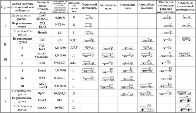 Таблица 1.3 Требования к типажу грузовых автомобилей (Б – бензиновый; Д – дизельный; Г – газобаллонный)
