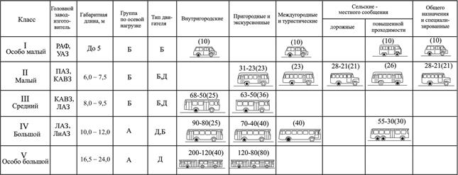 Предполагается, что в 2005 г. в России парк легковых автомобилей составит 24—26 млн. штук, грузовых — 4, 0—4, 2 млн. штук, автобусов — 250 тыс. штук, т.е. на каждые 1000 жителей будет приходится более 200 автомобилей. Ожидается, что в ближайшие 10 лет количество автомобилей в России возрастет в 1, 6—1, 8 раза. Таким образом, по темпам насыщения автомобилями Россия приближается к передовым странам мира. Такова перспектива количественного уровня автомобилизации России, из которой следует исходить, планируя развитие дорожной сети, уровень загрузки дорог движением и техническую политику в области ремонта и содержания дорог, организации и безопасности движения. Не менее важно учитывать и тенденции качественного развития автомобилей, и прежде всего параметров и систем, оказывающих влияние на требование к параметрам и транспортно-эксплуатационному состоянию дорог. Классификация автомобилей. По автомобильным дорогам общего пользования движутся грузовые и легковые автомобили, а также автобусы, которые делятся на классы, причем для каждого вида автомобиля приняты различные характеристики для отнесения к тому или иному классу (табл. 1.1).
