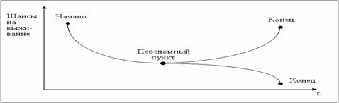 Фінансове оздоровлення підприємства є моментом необхідним для підприємства, фінансовий стан якого нестійка. Під фінансовим станом розуміється наявність у підприємства достатнього запасу фінансової міцності для підтримки ділової активності і надійності як економічного партнера по бізнесу, здатність підприємства фінансувати свою діяльність. Фінансовий стан може бути стійким, нестійким і кризовим. Саме фінансова криза ставить питання про фінансове оздоровлення підприємства. Розглянемо більш детально поняття криза. " Класична" економічне поняття кризи, означає не бажану і драматичну фазу в капіталістичній економічній системі, що характеризується коливаннями і негативними явищами, перешкодами. У цьому сенсі поняття кризи довгий час займало міцне місце в схемі теорій кон'юнктур у розвитку економіки. Так циклічна схема Шпітхоффа містить стадії: спад - перший підйом - другий підйом - пік - брак капіталу - криза [23, c. 26]. Розроблена на початку століття схема Харвард розрізняє: Депресія - Відновлення - Процвітання - Фінансова напруга - Виробничий Криза [24]. Але дане визначення не враховує багатьох різних схем і стадій розвитку і функціонування економіки. Тому " класичне" визначення кризи було замінено більш багатозначним поняттям " економічна криза". Про економічну кризу за визначенням Мечлапа мова йде в тому випадку якщо " виникає небажане стан економічних відносин, нестерпно критичне становище великих верств населення і які виробляють галузей економіки". Сомбарт визначає економічну кризу як " економічне негативне явище, при якому масово виникає небезпека для економічного життя, дійсності" [14, c. 255]. У мікроекономіці використовується поняття " криза підприємства". У широкому сенсі воно означає процес, який ставить під загрозу існування підприємства. Поняття " криза підприємства / криза на підприємстві" описує в сучасній економічній літературі різні феномени в житті підприємства, від просто перешкод у функціонуванні підприємства через різні конфлікти аж до знищення підприємства, які як мінімум для даного підприємства можна характеризувати як катастрофічні. Далі криза підприємства можна розуміти як незапланований і небажаний, обмежений за часом процес, який в змозі суттєво перешкодити або навіть зробити неможливим функціонування підприємства. Криза підприємства являє собою переломний момент в послідовності процесів подій і дій. Типовим для кризової ситуації є два варіанти виходу з неї, або це ліквідація підприємства як екстремальна форма, або успішне подолання кризи (рис. 1.1).