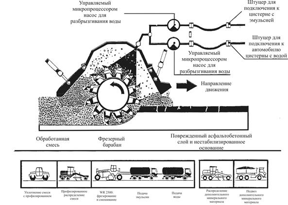 Существенное отличие этой технологии в том, что разогрев асфальтобетонного покрытия производится не горелками инфракрасного излучения, а нагретым до 600ОС воздухом, который обтекает поверхность покрытия, нагнетается в поры асфальтобетона под давлением, создаваемым компрессором и вакуумированием (откачиванием) воздуха. Подогрев воздуха может производиться сжиганием газа или дизельного топлива. Разогревающее устройство в виде герметически замкнутого прямоугольника (коробки) плотно прижимается к поверхности покрытия. В пространство между покрытием и разогревателем с одной стороны накачивается горячий воздух, а с другой стороны он отсасывается вакуумным насосом. Откаченный горячий воздух снова поступает в компрессор и так постоянно циркулирует. Это способствует многократному снижению потерь тепловой энергии при разогреве асфальтобетонного покрытия по сравнению с разогревом горелками инфракрасного излучения, полностью исключает выгорание битума и пережог смеси, а также выделение выбросов газа, дыма и пыли в атмосферу. Ширина обрабатываемой полосы может изменяться в диапазоне 3, 3—4, 0 м, глубина разогрева до 50 мм, скорость движения комплекта от 5 до 7 м/мин. За одну смену комплект обрабатывает полосу длиной около 3 км. Общая длина комплекта в работе составляет 75 м. Эффективность работы этого комплекта особенно высока при больших объёмах. Комбинированные способы горячей регенерации состоят в том, что асфальтобетон старого покрытия снимается горячей фрезой, отправляется на стационарный асфальтобетонный завод, где он перерабатывается горячим способом с добавлением к старому асфальтобетону битума и около 60 % новых материалов. Полученная смесь в горячем состоянии укладывается в покрытие на той дороге, где была получена старая смесь, или на другой дороге. Методы холодной регенерации включают в себя снятие и размельчение материала слоёв асфальтобетонного или цементобетонного покрытия, их обработку органическим или минеральным вяжущим с добавлением или без добавления новых минеральных материалов, укладку и уплотнение. Методы рециклинга чаще применяют при реконструкции дорог и поэтому в данной работе рассмотрены только кратко. Одной из основных технологических операций холодной регенерации являются снятие и размельчение материалов слоёв существующей дорожной одежды. Эти операции обычно производят с помощью холодных фрез. Для большинства асфальтобетонных покрытий, за исключением случая, когда заполнитель имеет очень низкую прочность, зубья планировщика разрушают старое дорожное покрытие по линиям асфальтовяжущего вещества. При этом гранулометрический состав исходной смеси изменяется очень мало и снятые куски и щебёнки асфальтобетона обычно покрыты вяжущим, что позволяет использовать их для приготовления новой смеси с минимальным расходом битума или битумной эмульсии. Холодным фрезерованием можно снимать старое покрытие послойно и тем самым отделять материал верхнего слоя из мелкозернистого асфальтобетона от материала нижнего слоя из крупнозернистого асфальтобетона с последующей укладкой в соответствующие слои дорожной одежды. Холодное фрезерование дорожного покрытия применяют для снятия старого покрытия с трещинами, чтобы предупредить их выход на новое покрытие при усилении дорожной одежды; д