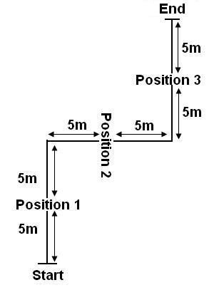 Команды: Стоять, Сидеть, Лежать, Рядом (4 раза) Выполнение упражнения. Упражнение выполняется в соответствии с приложенной схемой. Во время движения по указанию стюарда спортсмен подает собаке команды остановиться, сесть и лечь. Темп движения — нормальный. Должны быть выполнены левый и правый поворот. Точки поворота должны быть отмечены маленькими конусами. Порядок позиций и порядок поворотов направо и налево может быть различным, однако должен быть одинаков для всех участников соревнования. Стюард подает указания, когда начать движение, когда командовать собаке и когда поворачиваться кругом. Остановки должны быть примерно в середине (5 м) десятиметровой линии отрезка. Спортсмен продолжает двигаться 5 м (примерно до следующей точки поворота), поворачивает кругом по команде стюарда, двигается к собаке, проходит примерно в полуметре от нее (чтобы собака была слева), проходит еще примерно 2 м, разворачивается по команде стюарда и идет к собаке. Дойдя до нее, спортсмен без остановки подает команду «рядом». Они идут к следующей точке поворота (5 м), поворачивают налево или направо и двигаются до следующей точки остановки в середине линии. Упражнение продолжается подобным образом. Заканчивается упражнение, когда стюард дает команду остановиться и объявляет «конец упражнения». Положение корпуса собаки должно быть параллельным воображаемым линиям, соединяющим точки старта/поворота/окончания упражнения. Расстояние между собакой и точками поворота должно быть около 0, 5 м, принимая во внимание размер собаки. Повороты должны выполняться под углом 90 градусов, а не закругленными. Спортсмен и собака должны проходить угловые конусы справа, оставляя их слева. Оценка упражнения: Если собака не принимает одну из требуемых позиций (например, садится вместо укладки) или пропускает одну из позиций (не останавливается в правильной позиции в течение длины одного корпуса), ей присуждается не более 7 баллов. Если требуется вторая команда для остановки или занятия позиции, позиция не засчитывается. Если собака не останавливается в нужной позиции до того, как спортсмен развернется, упражнение не выполнено. Если собака идет за спортсменом после команды, ей может быть подана одна дополнительная команда. Если она занимает позицию до разворота спортсмена, она может продолжить упражнение, но получит не более 6 баллов. Баллы за выполнение команды начисляются в случае, если собака продвинулась не более чем на длину корпуса и приняла требуемое положение (стоять, сидеть, лежать) до того, как спортсмен достиг точки разворота. Чтобы получить баллы за упражнение, собака должна принять не менее двух требуемых положений. При оценке упражнения внимание также должно уделяться движению рядом. Медленное движение, плохое хождение рядом, изменение темпа, закругленные повороты и неровное движение спортсмена (параллельность движения воображаемым линиям) являются ошибками. Повторные команды на позициях не допускаются. Если собака неправильно выполняет команду и спортсмен это замечает, он не может дать дополнительную команду. Эта позиция уже в любом случае считается невыполненной. Дополнительная помощь собаке телом и двойные команды сильно штрафуются.