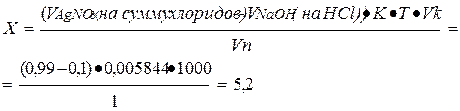 На титрование ушло 0, 99 мл 0, 1М раствора кислоты хлористоводородной, т.е. оттитровалась сумма хлоридов. Т.к. фактор эквивалентности в обоих случаях равен 1, то соответственно содержание натрия хлорида в граммах: Расчет отклонения: Относит.ошибка: 0% (по П №305 допустимо 3%).