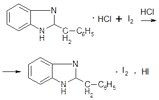 Т.е. примерно 0, 01-0, 02 дибазола помещают в колбу, добавляют 4-5 капель разбавленного раствора хлористоводородной кислоты, тщательно перемешивают и медленно наслаивают 3-5 капель 0, 1н раствор йода. При этом на поверхности раствора образуются зеркальные красноватые чешуйки.