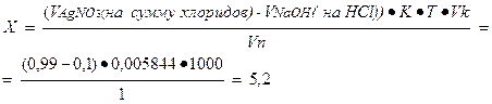 Т.к. 5, 2 грамма натрия хлорида содержится в 1000мл раствора, то в 1мл содержится 0, 0052г На титрование ушло 0, 99 мл 0, 1М раствора кислоты хлористоводородной, т.е. оттитровалась сумма хлоридов. Т.к. фактор эквивалентности в обоих случаях равен 1, то соответственно содержание натрия хлорида в граммах: