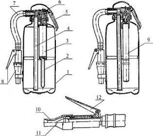 Рис. 7.5. Порошковые огнетушители унифицированные Для приведения огнетушителя в действие необходимо выдернуть опломбированную чеку и отвести вверх рукоятку запуска 5, при этом боек приводит в действие источник газа 3 или 9, в результате чего рабочий газ через газоотводную трубку 2, при использовании ИХГ, или отверстия в корпусе 9 газогенератора ГГУ аэрирует порошок и создает внутри корпуса огнетушителя требуемое избыточное давление. Дальнейшее управление работой огнетушителя осуществляется путем нажатия кистью руки на ручку 12 пистолета-распылителя 8, при этом огнетушащий порошок через гибкий рукав 7 и пистолет-распылитель подается на очаг пожара. Порядок работы и техническое обслуживание огнетушителей Тушение необходимо производить с наветренной стороны с расстояния не менее 3-4 метра. После окончания тушения необходимо нажать на ручку 3 и выбросить остаток порошка. Заряженные огнетушители при хранении и транспортировании могут находиться как в вертикальном, так и в горизонтальном положении. Один раз в четыре года необходимо производить освидетельство- вание огнетушителя. Перезарядка, ремонт и освидетельствование огнетушителей должны производиться в специализированных организациях.