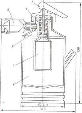 Рис 12.8. Огнетушитель химический воздушно-пенный ручной ОХВП-10: 1 корпус, 2 —- стакан для кислотной части заряда, 3 — верхнее днище, 4 крышка с клапанным устройством, 5 — рукоятка, 6 — насадок '