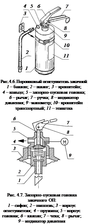 Огнетушители ОП(Г). Они отличаются от огнетушителей ОП наличием газогенерирующего устройства, устанавливаемого внутри корпуса. Они имеют ряд достоинств. Давление в корпусе огнетушителя отсутствует, поэтому они более надежны в работе и безопасны при хранении. Их масса при одинаковой вместимости меньше, чем у ОП с другим способом вытеснения огнетушащего вещества. Важна также простота перезарядки, так как не требуется компрессорное оборудование. Особенностями конструкции ОП(Г) является (рис. 4.9) то, что запорная головка 4 в сборе и трубка сифонная 5 выполнены и установлены раздельно. Поэтому управление выпуском порошка осуществляется только пистолетом 7. Принципиальная схема головки ОП(Г) представлена на рис. 4.10. В корпус головки 2 ввинчивается генератор 1. Некоторые параметры технических характеристик ОП (Г) приведены в табл. 4.6. Таблица 4.6