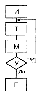 Вычислительный процесс называется ветвящимся, если для его реализации предусмотрено несколько направлений (ветвей). Каждое отдельное направление процесса обработки данных является отдельной ветвью вычислений. Ветвление в программе — это выбор одной из нескольких последовательностей команд при выполнении программы. Выбор направления зависит от заранее определенного признака, который может относиться к исходным данным, к промежуточным или конечным результатам. Признак характеризует свойство данных и имеет два или более значений. Ветвящийся процесс, включающий в себя две ветви, называется простым, более двух ветвей — сложным. Сложный ветвящийся процесс можно представить с помощью простых ветвящихся процессов. Направление ветвления выбирается логической проверкой, в результате которой возможны два ответа: «да» — условие выполнено и «нет» — условие не выполнено. Следует иметь в виду, что, хотя на схеме алгоритма должны быть показаны все возможные направления вычислений в зависимости от выполнения определенного условия (или условий), при однократном прохождении программы процесс реализуется только по одной ветви, а остальные исключаются. Любая ветвь, по которой осуществляются вычисления, должна приводить к завершению вычислительного процесса. На рис. 1б показан пример алгоритма с разветвлением для вычисления следующего выражения: Y = (а+b), если Х < 0; с/b, если Х> 0. Циклическими называются программы, содержащие циклы. Цикл — это многократно повторяемый участок программы. В организации цикла можно выделить следующие этапы: • подготовка (инициализация) цикла (И); • выполнение вычислений цикла (тело цикла) (Т); • модификация параметров (М); • проверка условия окончания цикла (У). Порядок выполнения этих этапов, например, Т и М, может изменяться. В зависимости от расположения проверки условия окончания цикла различают циклы с нижним и верхним окончаниями (рис. 2). Для цикла с нижним окончанием (рис. 2а) тело цикла выполняется как минимум один раз, так как сначала производятся вычисления, а затем проверяется условие выхода из цикла. В случае цикла с верхним окончанием (рис. 2б) тело цикла может не выполниться ни разу в случае, если сразу соблюдается условие выхода.