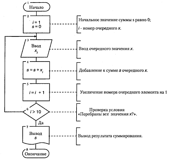Цикл называется детерминированным, если число повторений тела цикла заранее известно или определено. Цикл называется итерационным, если число повторений тела цикла заранее неизвестно, а зависит от значений параметров (некоторых переменных), участвующих в вычислениях. На рис. 3 показан пример циклического алгоритма вычисления суммы десяти чисел.