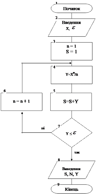 На схемі алгоритму (рис. 1) у блоці 3 задаються вхідні значення номера n - го члена ряду, що обчислюється, і початкове значення суми членів ряду S. У даному випадку n = 1 і S = 1, тобто обчислення починаються з другого члена ряду, тому що перший член ряду дорівнює одиниці і не обчислюється за загальною формулою члена ряду. Накопичення суми виконується в блоці 5 за допомогою рекурсивної залежності: S = S + Y, де Y – значення чергового обчисленого члену ряду.