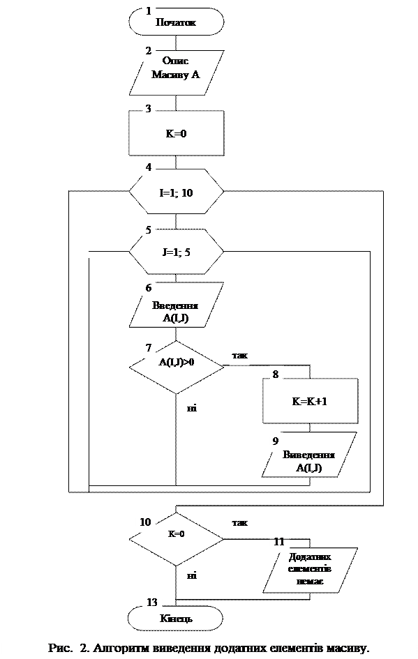 Двовимірний масив характеризується ідентифікатором, який має два виміри (індекси), і числом значень у кожному вимірі (верхньою межею кожного індексу). Положення елемента в двовимірному масиві визначається індексами. Один вказує на номер рядка, а другий - на номер стовпчика, на перетині яких розташовується елемент. Тобто елемент двовимірного масиву A представляється ідентифікатором A(i, j), де i - номер рядка масиву A; j - номер стовпчика масиву A. Розмір масиву (кількість елементів масиву) – добуток числа рядків на число стовпчиків масиву, тобто для масиву A(10, 5) його розмір складає 50. Порядок введення елементів двовимірного масиву (за рядками чи за стовпчиками), якщо він не пов'язаний з обробкою масиву, байдужний і організується за допомогою вкладеного циклу за будь-яким порядком проходження параметрів зовнішнього і внутрішнього циклів по i та j. При обробці двовимірного масиву, а також при введенні, пов’язаним з обробкою, порядок проходження параметрів зовнішнього і внутрішнього циклів по i та j визначається умовами задачі. При виведенні двовимірного масиву за параметр зовнішнього циклу приймається I (фіксується значення I та виводяться елементи рядків у внутрішньому циклі, змінюючи значення J). Приклад: Із матриці А(10, 5) вивести на друк додатні елементи. Схема алгоритму наведена на рис.1. Щоб скоротити обсяг алгоритму, введення елементів матриці A(I, J) та їх обробка об'єднані. Пропонується наступний порядок виконання вкладеного циклу. У зовнішньому циклі задається параметр циклу І, який дорівнює 1. Так як І< 10, то виконуються всі операції, що входять в даний цикл. Першою такою операцією є заголовок внутрішнього циклу, де параметру J задається значення 1, а потім вводиться значення елементу масиву А(1, 1). Далі виконується перевірка умови А(1, 1)> 0. Якщо умова виконується, то збільшується значення лічильника К на 1 і виводиться значення елемента А(1, 1); якщо умова не виконується, то виконується перехід на продовження внутрішнього циклу J = 2, 3, 4, 5. Після закінчення внутрішнього циклу у зовнішньому циклі І приймає значення 2 і знов повторюється внутрішній цикл п’ять разів. Після 10 - кратного виконання зовнішнього циклу виконується перехід на блок “кінець”.