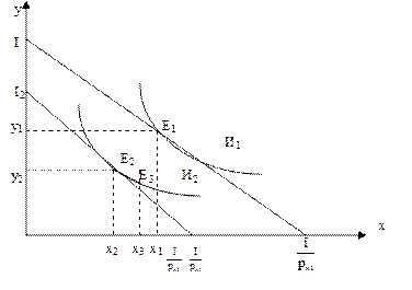 Вернемся к рассмотрению рис. 4.3. Ответим на вопрос: «На сколько снизилось благосостояние потребителя при увеличении цены на благо х?» Какую денежную сумму необходимо изъять у потребителя, располагающего определенным набором благ до повышения цены блага х, с тем, чтобы снизить его благосостояние, ровно на столько, на сколько повлияло увеличение цены на благо х. На сколько нужно снизить доход потребителя, с тем чтобы добиться таких же последствий как и повышение цены. Такой способ оценки благосостояния называется эквивалентной вариацией повышения цены. Эквивалентная вариация определяется перемещением первоначальной бюджетной линии Эквивалентной реакцией изменения цены блага х есть отрезок (I – I2) по оси ординат.