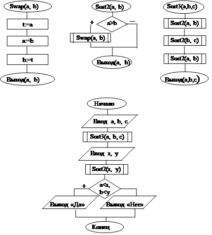 Фундаментом структурного программирования является теорема о структурировании. Она утверждает, что как бы ни сложна была задача, схема алгоритма может быть представлена с использованием ограниченного числа элементарных управляющих структур. Теорема о полноте. Базовые элементарные структуры: следование, разветвление и цикл - обладают функциональной полнотой, то есть любой алгоритм может быть реализован в виде композиции этих конструкций. Пример. Применим принципы структурного программирования для разработки и описания алгоритма решения следующей небольшой задачи. Требуется определить, пройдет ли кирпич с ребрами a, b и c в прямоугольное окно со сторонами х, у. Грани кирпича должны быть параллельны или перпендикулярны сторонам окна. Если бы стороны окна и ребра кирпича были упорядочены, то для решения задачи достаточно сравнить меньшую сторону с меньшим ребром и большую сторону со средним ребром. Выделяем подзадачи: 1. Упорядочение пары чисел по неубыванию. 2. Упорядочение тройки чисел по неубыванию. 3. Определение, пройдет ли кирпич с ребрами a£ b£ c в прямоугольное окно со сторонами х £ у. Алгоритмы решения задач 1 и 2 опишем, как алгоритмы для подпрограмм, в дальнейшем на них можно ссылаться в предопределенных блоках.