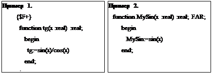 Для обеспечения первого условия перед описанием подпрограммы или подпрограмм можно указать директиву компилятора {$F+}, а после описания - {$F-} (пример 1), или после заголовка подпрограммы указать директиву FAR (пример 2). Если стандартную подпрограмму нужно передать в качестве параметра или присвоить переменной, то требуется создать некоторую «надстройку» (пример 2).