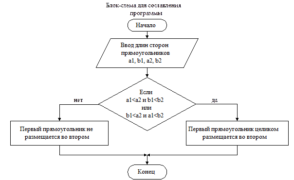 Пример 4. Два прямоугольника заданы длинами сторон. Написать программу, после выполнения которой выясняется, можно ли первый прямоугольник целиком разместить во втором. (Рассмотреть только случай, когда соответствующие стороны прямоугольников параллельны.)