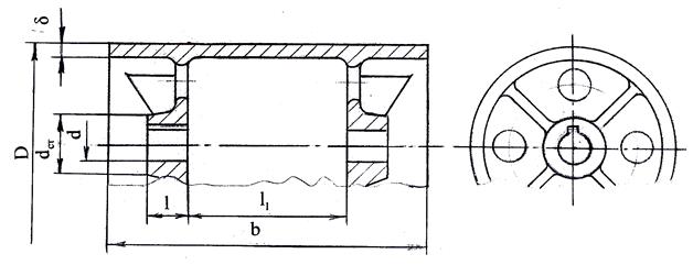 Диаметр барабана D указывается в исходных данных задания на курсовое проектирование. Ширина барабана b определяется в зависимости от заданной ширины ленты В по зависимости b = B + (150 – 200) мм. Диаметр отверстия в ступицах барабана d равен диаметру вала в месте посадки на него барабана, значение которого принимается немного больше диаметра заплечика для подшипников, желательно по ГОСТ 6636 – 69. Длина ступицы любого элемента конструкции назначается в зависимости от посадочного диаметра вала по условию обеспечения устойчивости элемента в вертикальной плоскости. Поскольку барабан опирается на вал двумя ступицами и они отстоят друг от друга на значительном расстоянии, устойчивость барабана будет обеспечена при любой длине ступиц. Длина обеих ступиц барабана l принимается равной длине шпонки, устанавливаемой только в ступице, расположенной ближе к концу вала со стороны подвода крутящего момента. Устанавливать шпонку во второй ступице барабана не имеет смысла. Из-за разной крутильной жёсткости вала и барабана невозможно точно определить нагрузку на шпонку во второй ступице. Расчёт шпоночного соединения приведен в п. 6. Диаметр ступиц барабана Толщину обода и дисков