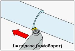 Подачей - S (международное обозначение f) называется величина перемещения режущей кромки инструмента относительно заготовки в направлении движения подачи за единицу времени. Измеряется подача в миллиметрах за одну минуту (мм/мин) или за один оборот заготовки или инструмента (мм/об).