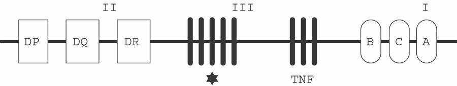 Главный комплекс гистосовместимости (ГКГС или HLA) является ключевым звеном иммунного ответа (см. также краткую справку о ГКГС в разделе “Основы медицинской конституционологии”). Его продукты контролируют не только трансплантационный иммунитет, но и принимают участие в детальной регуляции других иммунных реакций. Фундаментально роль антигенов гистосовместимости в иммунном ответе была изучена Р.М. Цинкернэйджелом и П.К. Догерти (1974-1978). HLA-система человека носит название ГКГС-комплекса, а его гены локализованы в коротком плече 6-ой хромосомы. К антигенам 1-го класса относятся ГКГС-A, -B и С-локусы, а также неклассические локусы E, F и G; к классу 2 - ГКГС-D (или -DR), -DP, -DQ локусы. Между областями этих генов находятся гены некоторых компонентов комплемента, часто называемые класс 3 ГКГС. Любопытно, что гены ФНО также локализованы на участке ГКГС.