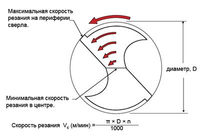 Рис. 29. Скорость резания в центре сверла и на периферии.