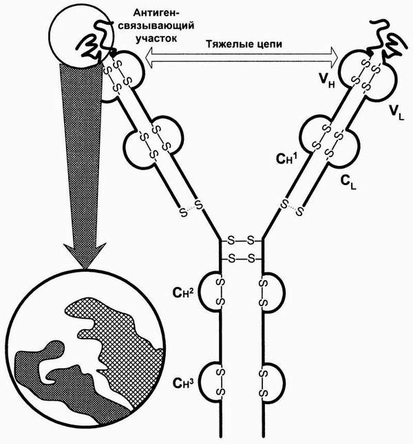 Существование антител, как “оторвавшихся от клетки рецепторов” постулировал впервые П.Эрлих (1901). Структура иммуноглобулинов была, в основных чертах, расшифрована Р.Р. Портером и Дж.М. Эйдельманом (1957-1962). Молекулы Ig состоят из полипептидных цепей, соединенных друг с другом дисульфидными мостиками. Они имеют характерную пространственную конфигурацию, содержат также углеводородные группировки, хотя последние непосредственно не относятся к специфической части антител.