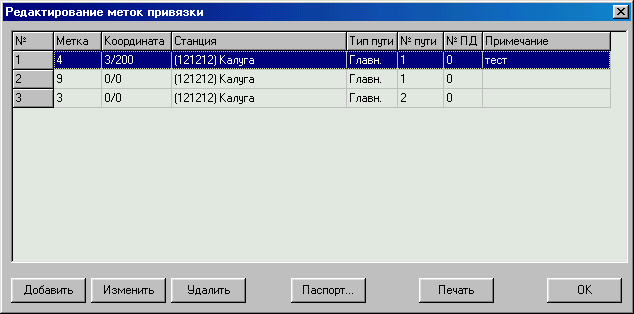 Рис. 28 Окно меток привязки При добавлении или изменении метки привязки появляется окно, показанное на Рис. 29. В нем задаются код метки, номер и тип пути, номер ПД участка, координата начала, а также название станции. Возможно добавление произвольного примечания.