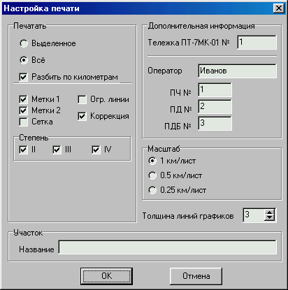Рис. 34. Диалог настройки печати В разделе «Дополнительная информация» окна «Настройка печати» следует ввести номер тележки, Ф.И.О. оператора, номера ПЧ, ПД, ПДБ в соответствующих строках ввода. В разделе «Участок» окна «Настройка печати» следует ввести наименование участка, номер пути. Можно выбрать один из трех возможных масштабов печати путеизмерительной ленты: 0.25 км/лист, 0.5 км/лист (рекомендуется) и 1 км/лист. Для выбора масштаба печати надо щелкнуть «мышью» на соответствующей надписи в разделе «Масштаб». В зависимости от выбранного масштаба печати будут приняты следующие масштабные коэффициенты: 0.25 км/лист (в 1 см 10 м) – уровень - 1: 2; шаблон - 1: 1. 0.5 км/лист (в 1 см 20 м) – уровень - 1: 2; шаблон - 1: 1. 1 км/лист (в 1 см 40 м) – уровень - 1: 4; шаблон - 1: 2. Параметр «Толщина линий графиков» определяет относительную толщину линий графика при печати. После заполнения формы вывода на печать, следует нажать кнопку «ОК» окна «Настройка печати» (нажатие кнопки «Отмена» означает отказ от печати). Появится стандартное диалоговое окно «Настройка принтера». Для осуществления нормальной печати ленты необходимо установить следующие параметры настройки принтера. Размер бумаги: A4 210 х 297 мм; Ориентация: Книжная; Графический режим: Точечная графика (если существует). Нажатие кнопки «ОК» окна «Настройка принтера» запускает процесс печати ленты с заданными параметрам, нажатие кнопки «Отмена» отменяет печать.
