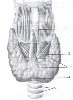 Мал. 9. Схема будови щитоподібної залози: 1 — щитоподібний хрящ; 2 — перешийок; З — дві частки залози (права і ліва); 4 — фолікул; 5 — хрящі гортані