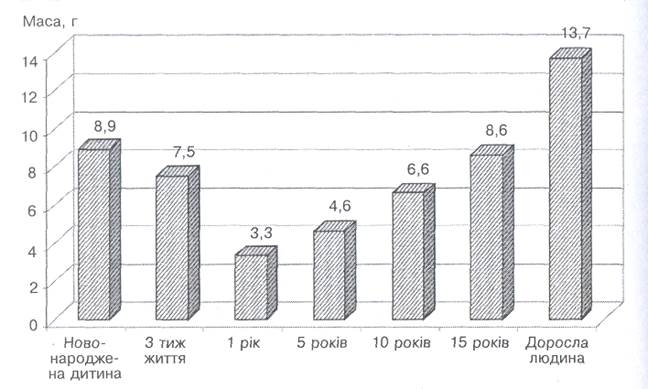 Мал. 13. Середня маса надниркових залоз у дітей різного віку та в дорослої людини