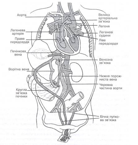 Серце протягом 30 днів зменшує свою масу за рахунок зменшення правого шлуночка на 20 %. У момент народження правий і лівий шлуночки майже рівні й мають стінки завтовшки 5 мм. Кровообіг у новонародженого змінюється з першим вдихом (мал. 30).