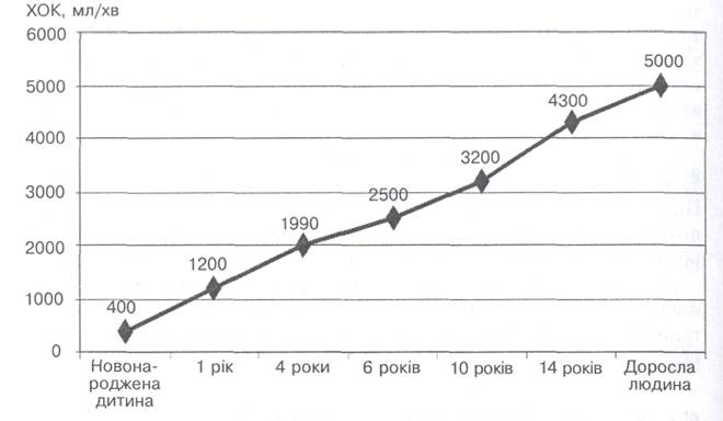 Мал. 34. Зміни хвилинного об'єму крові (ХОК) у дітей різного віку
