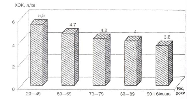У старості зменшується ЧСС, ударний об'єм серця. З віком знижується хвилинний об'єм крові? (мал. 36). З 50 років серцевий викид зменшується на 1 % у рік за рахунок зменшення систолічного об'єму і зменшення ЧСС.'Достачання кисню зменшується з віком на 0, 6 % у рік. Зниження ХОК розглядають як реакцію серцево-судинної системи на знижену потребу тканин організму в кисні.