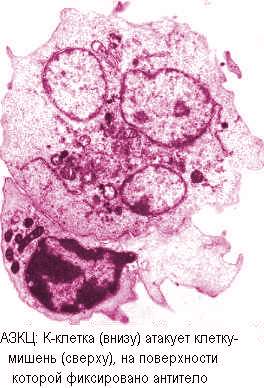 Механизмы альтерации при цитотоксических реакциях, в основном, были рассмотрены выше. Кратко напомним их: · активация иммунным комплексом на поверхности клетки-мишени комплемента. · опсоническое действие цитотоксических антител и фрагментов активированного комплемента, в частности С3b и C3d, запускающее фагоцитоз клеток-мишеней или, для крупных и фиксированных в ткани объектов - фрустрированный фагоцитоз с экзоцитозом медиаторов. · Цитотоксические антитела способны опосредовать прикрепление больших гранулярных лимфоцитов и других К-клеток - к клеткам-мишеням и вызывать повреждение путем антителозависимой клеточной цитотоксичности (АЗКЦ). При АЗКЦ антитела первично специфически связываются Fab-фрагментами с соответствующими детерминантами клеточной мембраны; это специфическая стадия. Во второй - неспецифической стадии клетки, несущие рецепторы к Fc-фрагменту антител (макрофаги, лимфоциты, моноциты, гранулоциты) активируются, причем макрофаги и К-клетки, а при противоопухолевых реакциях - и NK-клетки (нуль-клетки - лимфоциты, которые проявляют активность в АЗКЦ, но не несут маркеров, типичных для Т- и В-лимфоцитов) способны оказать цитотоксический эффект на клетку, помеченную антителами, с помощью перфориноподобного механизма, не поглощая мишень. Механизм АЗКЦ может иметь значение при ряде аутоиммунных заболеваний (хронический прогрессирующий гепатит, язвенный колит, тироидит, и пр.), антиопухолевом иммунитете, паразитарных и вирусных заболеваниях, а также реакциях отторжения трансплантата.