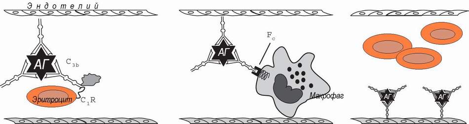 У приматов в этой системе ключевую роль играют эритроциты, комплемент и макрофаги. В норме иммунные комплексы фиксируются эритроцитами, через С3в фрагмент комплемента и CR1 рецептор эритроцитов, что предохраняет их от контакта с сосудистой стенкой, так как основная часть красных кровяных клеток следует в осевом кровотоке. В синусоидах селезенки и печени, при турбулентном кровотоке, нагруженные иммунными комплексами эритроциты захватываются макрофагами, при участии Fc-рецепторов. Некоторая часть свободных иммунных комплексов, отщепленных от носителей в результате действия фактора I комплемента, захватывается макрофагами непосредственно (Ф.Хэй, 1994). По данным А.Я.Кульберга (1986), если иммуноглобулины принадлежат к классу IgA, они активируют комплемент альтернативным путём, что приводит к появлению в составе иммунных комплексов C3b - фрагментов комплемента. При классическом пути активации, если в состав комплекса входят IgG, они связывают C1q - фрагменты комплемента. C1q - фрагменты фиксируются нековалентно, а значит - обратимо, к Сg2-домену Fc-фрагмента IgG между аминокислотными остатками N 282 и N 292. После связывания антигена угловое расстояние в молекуле IgG между Fab-фрагментами возрастает. Fc-фрагмент выходит из плоскости, в которой расположены Fab-фрагменты. Это облегчает связывание C1q. C1q по размеру в 2, 5 раза больше IgG, поэтому его связывание приводит к экранированию части Fc-фрагмента, в связи с чем присоединение комплемент-активирующими антителами С1q мешает их захвату макрофагами (“интерференция эффекторных функций иммуноглобулинов” - по Кульбергу). В ходе дальнейшей активации комплемента, С3b-фрагмент, присоединяясь к комплексу ковалентно, в области Fd -участка Fab-фрагментов, вызывает стерические изменения комплекса, благоприятствующие отщеплению С1q и элиминации комплекса макрофагом. По Х.Такахаши (1980), присоединение С3b повышает растворимость иммунных комплексов, что может быть результатом отщепления C3b и С4b В соответствии с этим, в норме в IgG-cодержащих комплексах присутствуют C3b и С4b и отстуствует С1q. Иммунные комплексы с IgM cодержат как C3b и С4b, так и С1q. Из сказанного ясно, что приобретенные и наследственные дефекты и нехватка С3 и других фрагментов комплемента, Fc-рецептора макрофагов, СR1 - рецептора эритроцитов и самого Fc-фрагмента антител (включая его углеводный компонент) будут предрасполагать их носителей к иммунокомплексным болезням. Это подтверждается наблюдениями о наличии повышенной частоты иммунокомплексных процессов у лиц с наследственным дефицитом С3 и с гипокомплементемией в результате эндотоксинового шока, ожоговой болезни и других процессов с избыточной активацией комплемента по альтернативному пути. Обнаружены генетические дефекты Fc-peцепторов и Fc-фрагментов у больных СКВ и их ближайших родственников (Т.Фрэнк и соавт. 1983). Описаны аутоантитела к конвертазе альтернативного пути комплемента - C3bBb-фрагменту, вызывающие дефицит C3b и мембранозно-пролиферативный иммунокомплексный гломерулонефрит II типа - “болезнь плотных отложений” (С.Р.Нусинов и соавт., 1985). Эти аутоантитела даже называют “нефритогенным фактором”.