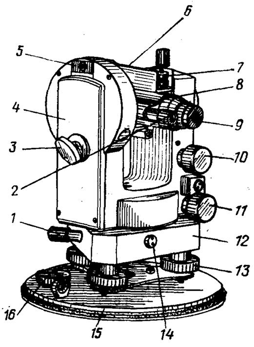 Рисунок 1 – Теодолит 2Т30П (положение КЛ): 1 — наводящийвинт лимба; 2 — окуляр микроскопа; 3 — зеркало подсветки; 4 — боковая крышка; 5 — посадочный паз для буссоли; 6 — уровень при трубе; 7 — юстировочная гайка; 8 — колпачок; 9 — диоптрийное кольцо окуляра зрительной трубы; 10 — наводящий винт трубы; 11 — наводящий винт алидады; 12 — подставка; 13 — подъемные винты; 14 — втулка; 15 — основание; 16 — крышка