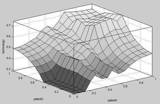 Рис. 3.4. Поверхность развития единых технологий авиационных двигателей по результатам экспертной оценки данных патентной статистики Для системного анализа полученного «ядра решений» из области высоких технологий (рис.3.3–3.4) на следующем шаге рекомендуется строить структурные модели в виде многовариантных графов развития единых технологий авиационного двигателя нового поколения. На таком графе обобщены только точки (вершины графа) узловых технологий (рис.3.5), отобранные на предыдущем шаге анализа с использованием метода нечеткой логики.