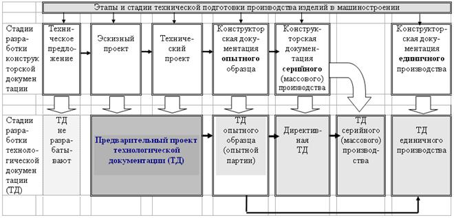 Стадии разработки технологической документации можно определить в соответствии с ЕСТД в табл. 1.1. Предварительный проект предназначен как для проверки технологичности конструкции изделия на стадиях эскизного и технического проектов, так и технологического обеспечения ОКР при создании техники новых поколений. Он содержит перечни специальных и типовых технологических процессов, технических заданий на разработку специального технологического оборудования и оснастки. Предварительный проект служит основанием для разработки рабочей технологической документации: опытного образца, установочной серии, серийного или массового производства. Для разработки предварительного проекта технологической документации рассмотрим вначале закономерности развития единых и узловых технологий авиадвигателестроения, что позволяет сформулировать проблемы, на решение которых должен быть ориентирован данный инновационный проект и разработка комплектов технологической документации.