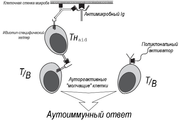 Ранние представления об антигенном перекресте, как причине аутоиммунитета, сводились к гипотезе, что трехмерная конформация некоторых чужеродных антигенов похожа на конформационные детерминанты собственных, что обусловливает, будто бы, аутореактивное действие антител к чужим антигенам. Однако, последующее развитие иммунопатофизиологии показало, что подобная ситуация - исключительная редкость. Полагают, что этот механизм обусловливает аутоиммунные осложнения африканского трипаносомоза (болезнь Чагаса), в частности, миокардиодистрофию, и некоторые последствия гельминтозов. Хрестоматийным является пример с полисахаридными антигенами гемолитического стрептококка и сердечных клапанов, перекрёст по которым способствует развитию ревматизма после инфекции определёными штаммами гемолитического стрептококка Гораздо чаще имеется перекрест по линейным, секвенциальным детерминантам аутоантигенов и чужеродных антигенов, так как эволюционное разнообразие этих детерминант, формируемых первичной структурой антигенов (А.Я. Кульберг, 1985), гораздо меньше, чем конформационных. Между тем, именно секвенс-пептиды процессированного антигена контролируют поведение Т-хелперов. Именно сходство или общность коротких пептидов, притом конкретно тех, которые, благодаря индивидуальным особенностям гаплотипа ГКГС, процессируются у предрасположенных пациентов антигенпредставляющими клетками, имеется ввиду, когда говорят о перекрестной иммунореактивности между альбумином коровьего молока и собственным инсулином, при развитии аутоиммунного сахарного диабета, между антигенами Klebsiella и соединительной ткани при анкилозирующем спондилите или миелина - при демиелинизирующих нейропатиях, между антигенами Proteus mirabilis и синовии - при ревматоидном артрите, высококонсервативными пептидами белков теплового шока микобактерий и разнообразными аутоиммунными синдромами. Имеется также общность коротких пептидов в М-протеине стрептококка и М-протеине сарколеммы кардиомиоцитов при ревматизме. Перекрестно реагирующий секвенциальный антиген микроба может поднять недостаточную концентрацию аутоантигена до уровня, позволяющего активировать подавленные аутореактивные Т-хелперы и увеличить их аффинитет во взаимодействии с антигенпредставляющими клетками (А.Ройт; 1994). Большое значение при ряде аутоиммунопатий имеет перекрест между идиотипом аутоантитела и идиотипом антитела к микробу. Это вызывает активацию аутореактивных лимфоцитов-эффекторов не аутореактивными, а идиотип-специфическими Т-хелперами. Идиотип-специфические хелперы нередко стимулируются антигенпредставляющими клетками, захватившими иммунный комплекс антител к микробу и антигена и процессировавшими пептид идиотипа этих антител. А.Кук и А.Лидьярд, впервые распознавшие подобный механизм аутоаллергии (1982), указывали, что именно так полисахарид К30 Klebsiella провоцирует образование аутоантител к ДНК, а протеогликан Streptococcus pyogenes - ревматоидных факторов. Обращает на себя внимание полное несходство в этих случаях химической природы и конформационных антигенных детерминант антигенов-мишеней, что не мешает косвенной мимикрии и перекресту. Подобная ситуация - не редкость и при неинфекционой патологии. Предполагается, например, что низкоаффинные естественные регуляторные аут