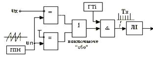 Принцип дії. Генератор пилкоподібної напруги (ГПН) генерує напругу від від'ємної до додатної. Спочатку компаратори знаходяться в нульовому стані. При напрузі ГПН трохи більшу за нульову спрацьовує нижчий компаратор, коли напруга ГПН рівна uх спрацьовує верхній компаратор, внаслідок чого на виході елементу виключаюче " АБО" створюється імпульс Тх, що заповнюється імпульсами ГТІ, а потім відбувається реєстрація (накопичення) цих імпульсів в лічильнику імпульсів (ЛІ). Перевагою такої схеми є те, що вона може перетворювати як позитивну, так і від'ємну вхідну напругу. Похибки: - від нестабільності напруги ГПН; - від частоти ГТІ; - дрейфу нуля компараторів. Схема чутлива до завад у вхідній напрузі. Це АЦП миттєвих значень.
