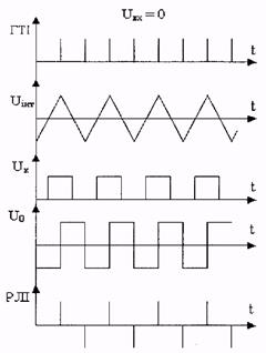 Кількість імпульсів, що надходить до суматорного і від'ємного входів буде рівною і результат вимірювання дорівнює нулю. При uх ≠ 0 симетрія порушується і кількість імпульсів, що приходять від ГТІ на РЛІ (реверсивний ЛІ) за час Т1 і Т2 будуть різними. Таким чином відбувається перетворення uх у відносну щілинність імпульсів і кодування цієї щілинності. Схема може реагувати на будь-яку полярність вхідного сигналу. Основні співвідношення:
